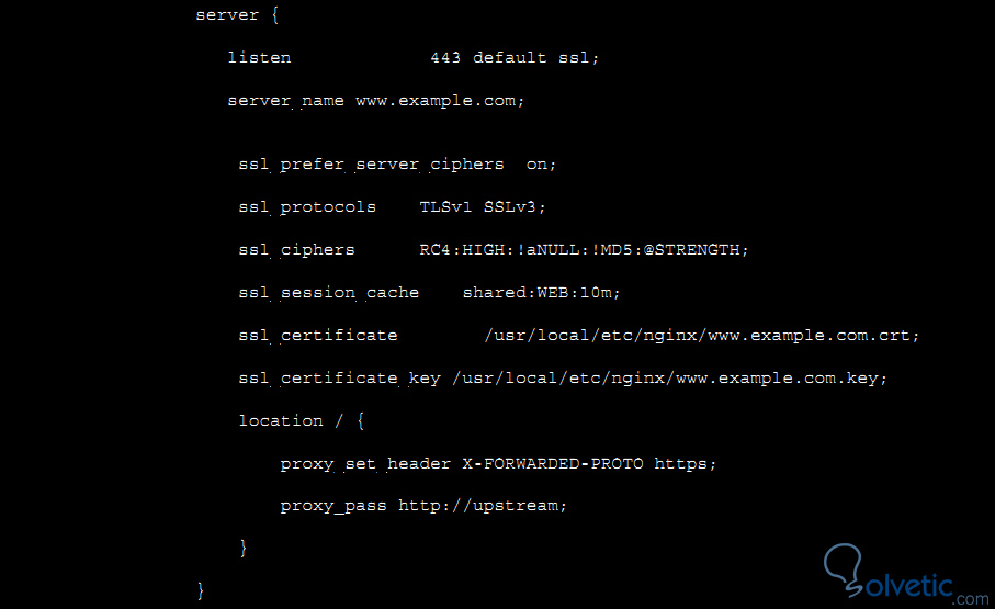 En el siguiente ejemplo vemos cómo podemos hacer una configuración de un certificado SSL en nuestro servidor Nginx: