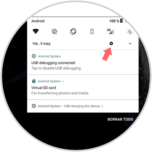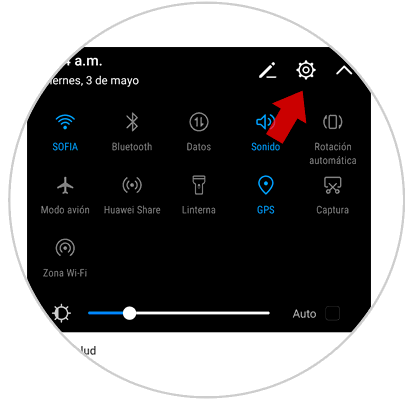 En primer lugar, debes desplegar el menú superior de la pantalla, independiente de la posición de la pantalla (horizontal o vertical), y en las diferentes opciones desplegadas pulsar en el ícono de engranaje el cual hace referencia a la configuración: