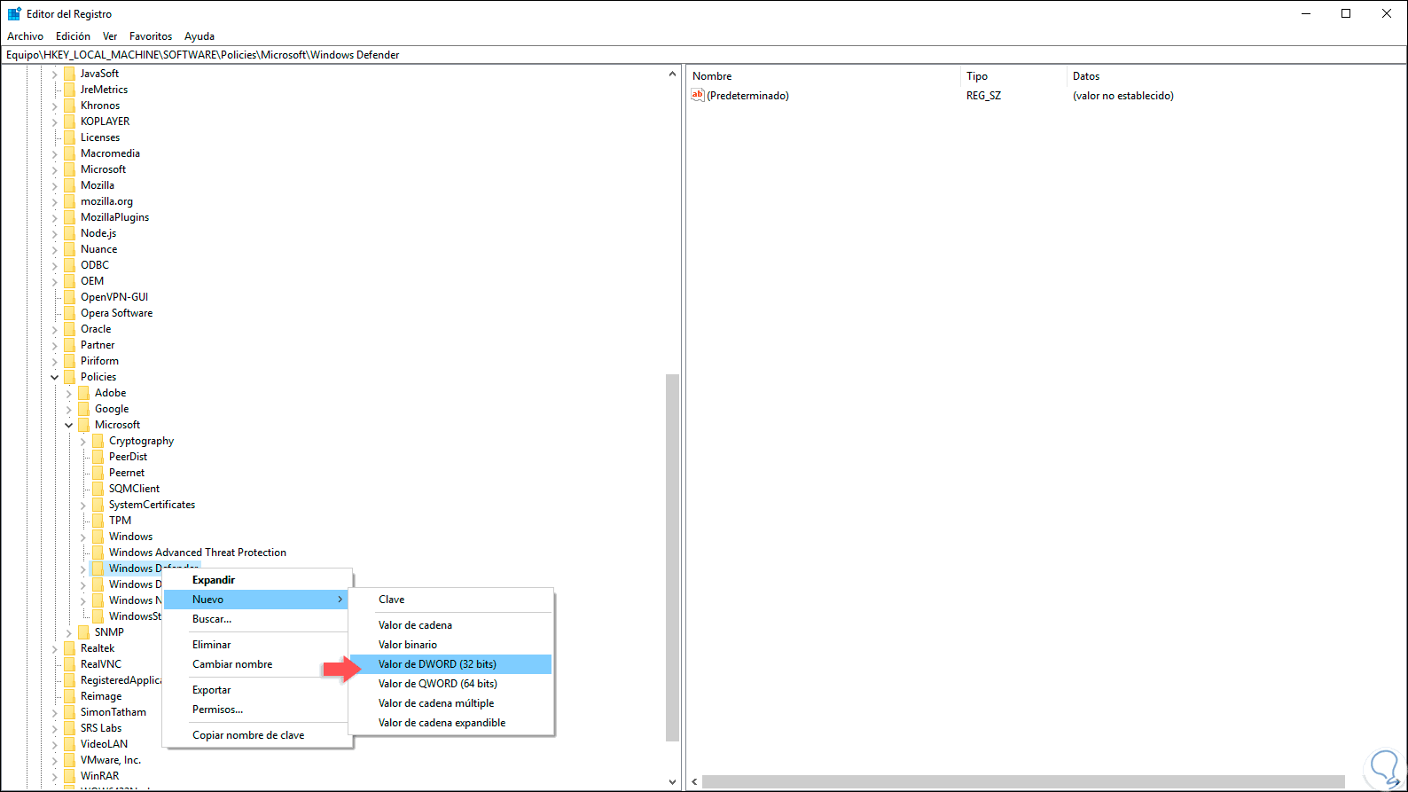 Allí daremos clic derecho sobre la clave “Windows Defender” y seleccionamos la opción Nuevo / Valor de DWORD (32 bits):