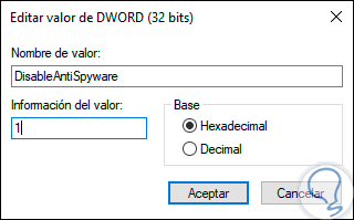 Damos doble clic sobre este nuevo valor y su valor por defecto será 0, este valor lo modificaremos a 1. Pulsamos en Aceptar para guardar los cambios. Reiniciamos el sistema para completar los cambios y para restaurar Windows Defender debemos eliminar este valor DWORD creado.