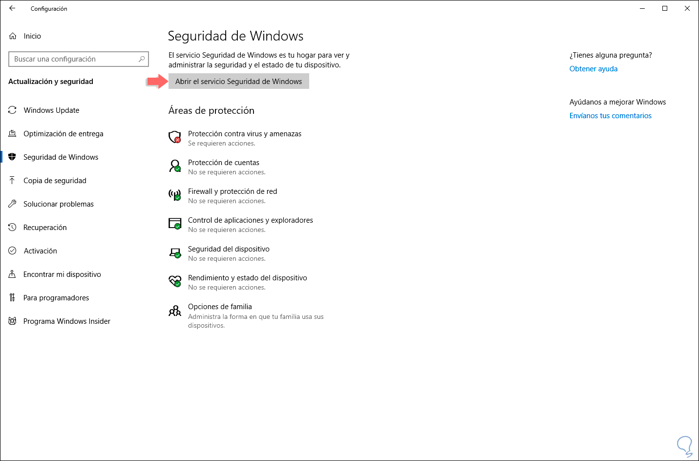 Allí damos clic en el botón “Abrir el servicio de Seguridad de Windows” para ser redireccionados a la plataforma de Windows Defender.