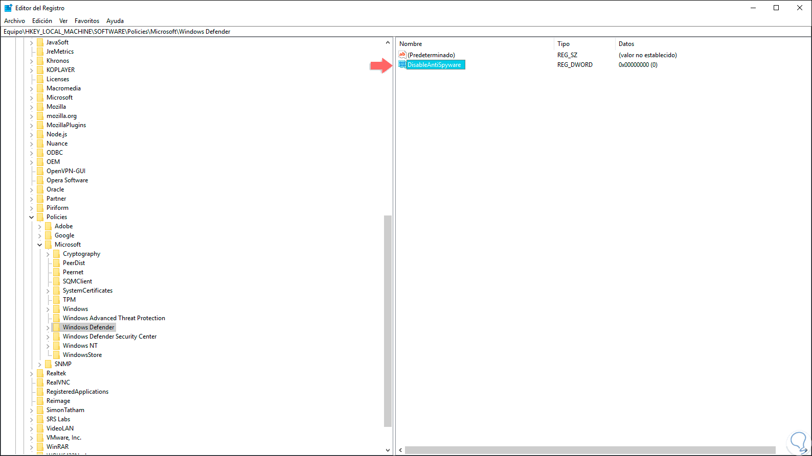 3. Desactivar Windows Defender en Windows 10 desde Editor de Registros