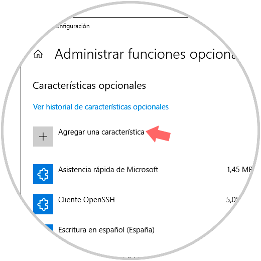 Damos clic en la línea “Administrar funciones opcionales” y veremos lo siguiente. Allí damos clic en el botón "Agregar una característica".