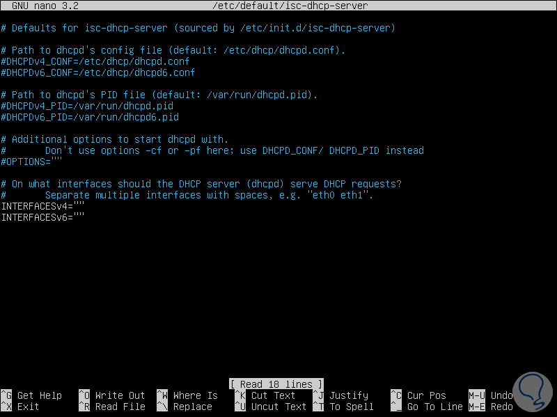 sudo nano /etc/default/isc-dhcp-serverAllí veremos lo siguiente: