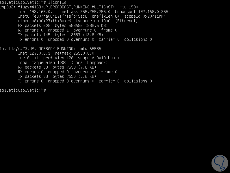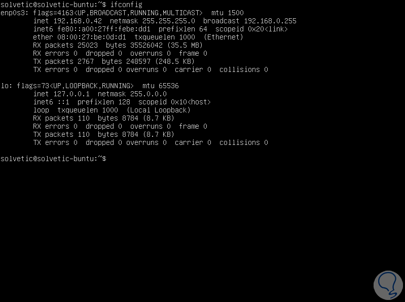 En este punto debemos saber en detalle el nombre de la tarjeta de red del servidor, para esto podemos ejecutar, antes de acceder al archivo, el comando ifconfig y allí veremos el nombre de la tarjeta el cual en este caso es enp0s3: