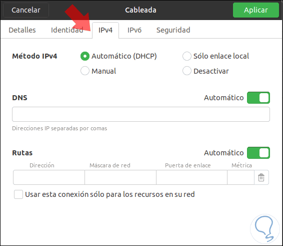 Allí damos clic sobre el ícono de piñón ubicado en el tipo de red y en la ventana desplegada vamos a la pestaña IPv4 y allí definimos en el campo Método IPv4 la casilla Automático (DHCP)