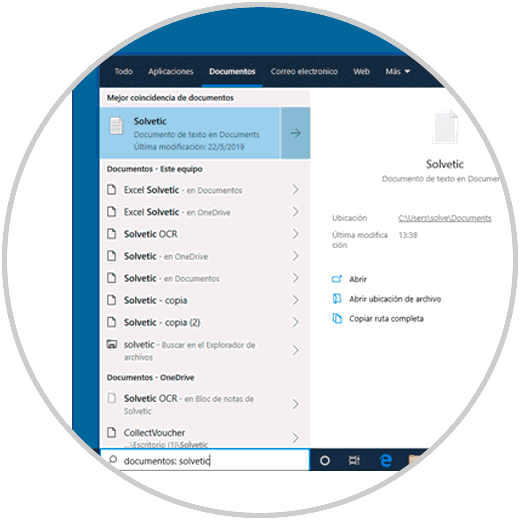 Ahora ingresamos el nombre del documento a buscar y Windows 10 llevará a cabo el proceso de búsqueda de documentos no solo en el Explorador de archivos sino también en los directorios locales y en OneDrive.
