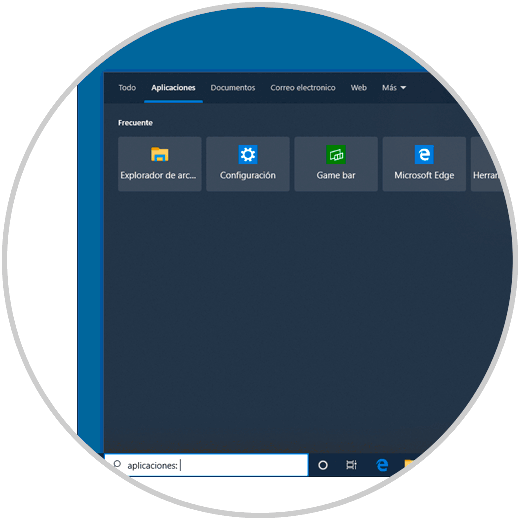 Para buscar una aplicación en Windows 10, damos clic en el cuadro de búsqueda y nos dirigimos a la pestaña “Aplicaciones” o bien podemos ingresar la sintaxis aplicaciones en el propio cuadro de búsqueda: