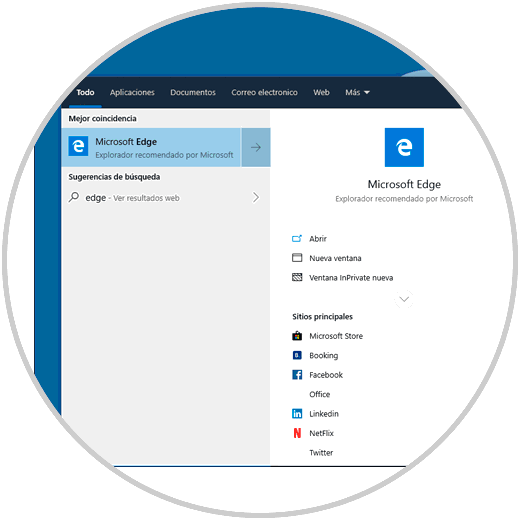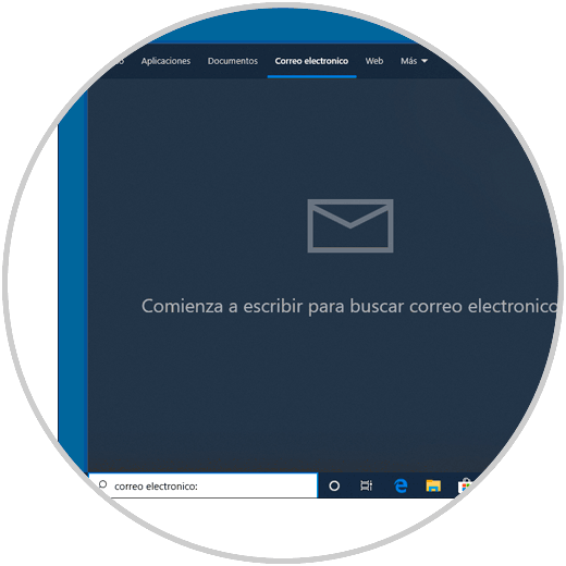 Para esta tarea, damos clic en el cuadro de búsqueda y nos dirigimos a la sección “Correo electrónico” o bien podemos ingresar la sintaxis correo electrónico en el cuadro: