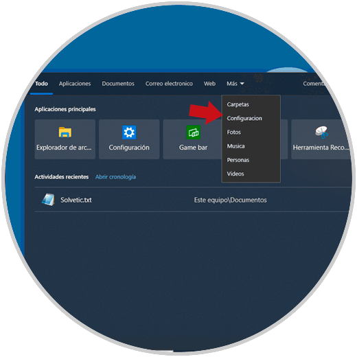 En este caso debemos dar clic en el cuadro de búsqueda y luego dar clic en el botón "Más" para allí seleccionar “Configuración”: