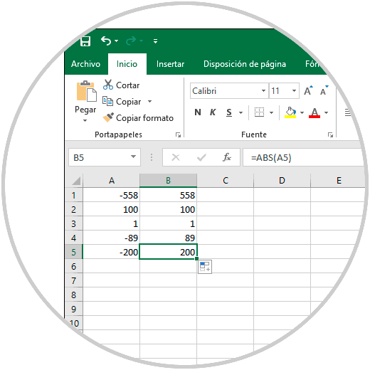 =ABS(A1)Como resultado de esto, podemos ver que el valor absoluto es un número positivo: