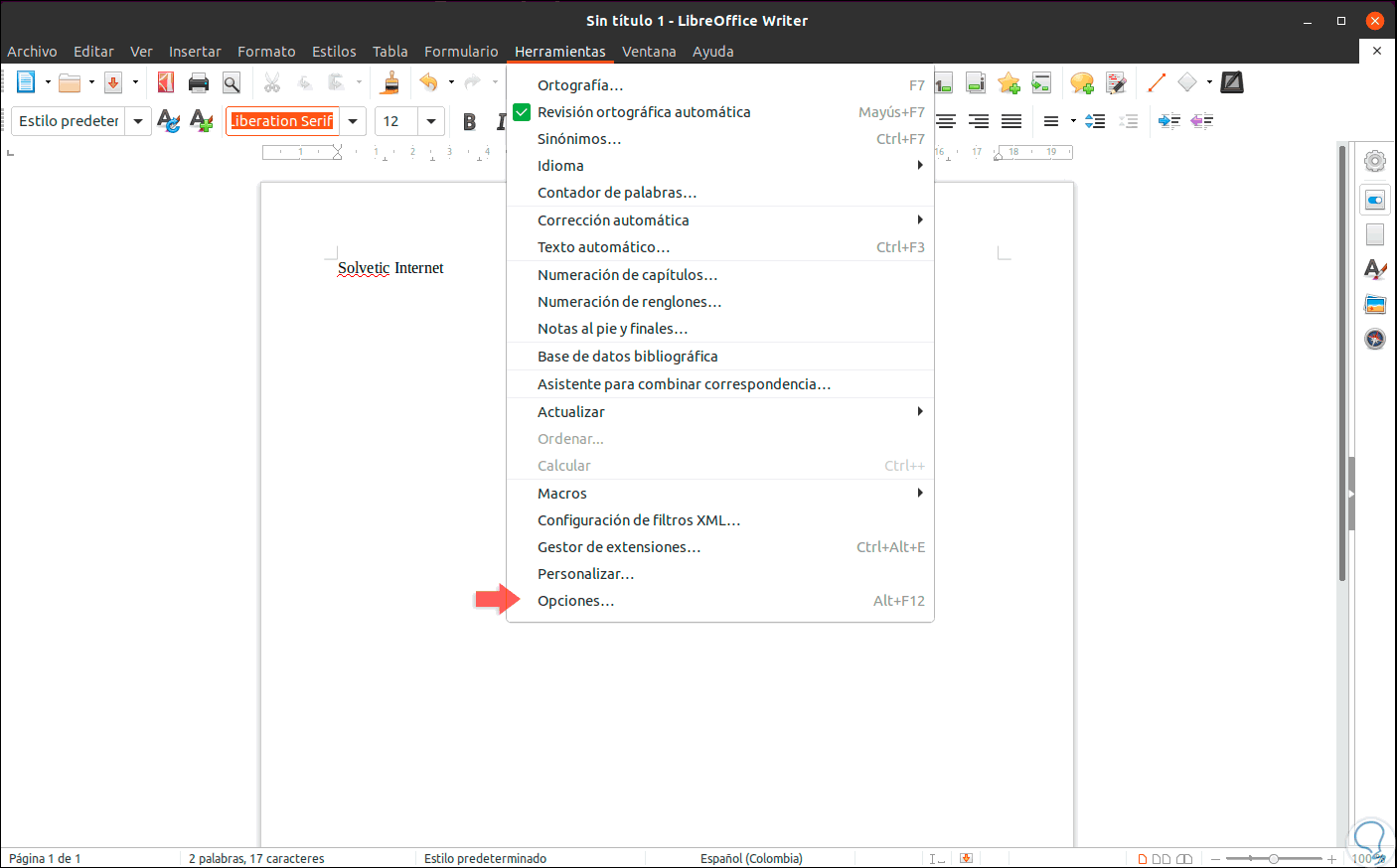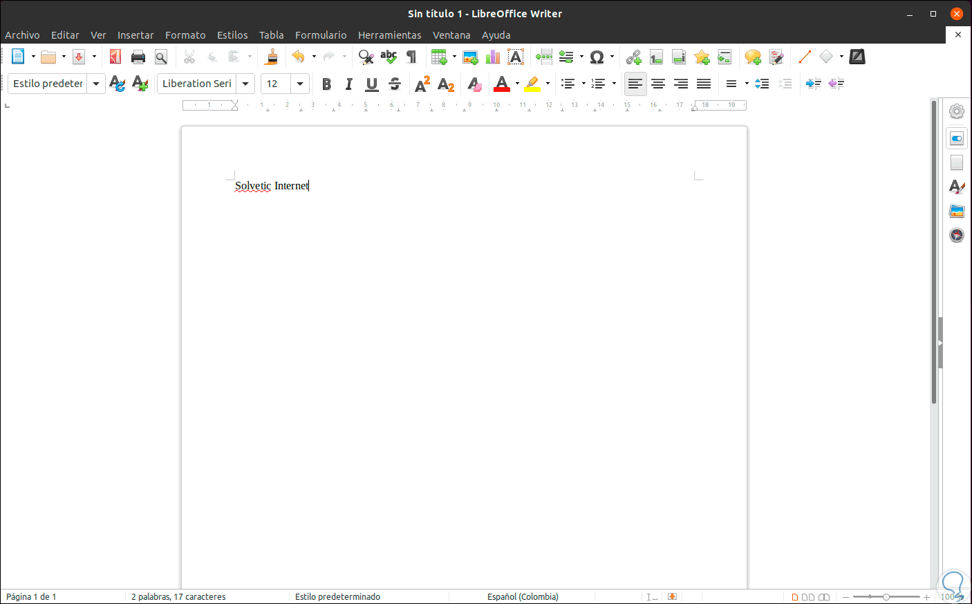 Cuando creamos un nuevo documento en Writer, la fuente establecida es Liberation Serif en un tamaño de 12 puntos: