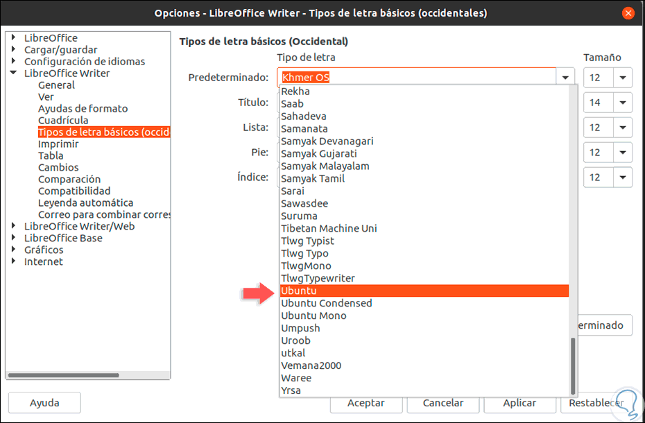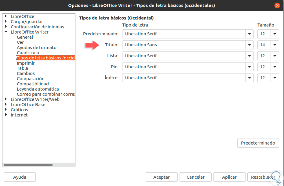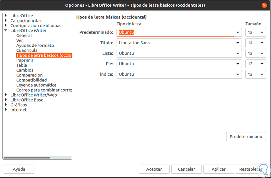 En la ventana emergente que será desplegada, vamos a la sección LibreOffice Writer y allí damos clic en la línea “Tipos de letra básicos (occidental) y podremos visualizar que la fuente por defecto es la mencionada, Liberation Serif: