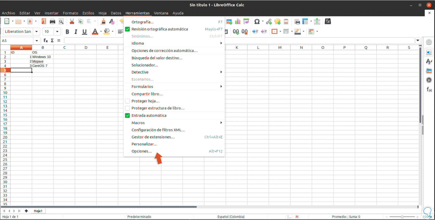 El proceso para editar la fuente predeterminada en LibreOffice Calc no difiere mucho de Writer, para ello vamos al menú Herramientas y seleccionamos Opciones o bien podemos usar las teclas siguientes: