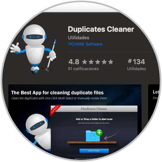Como mencionamos, otra de las posibilidades en macOS es el uso de aplicaciones para tal fin, una de estas, la cual es totalmente gratuita, es Duplicates Cleaner la cual podemos descargar directamente desde el App Store. Allí damos clic en el botón Obtener para proceder con la descarga e instalación de esta utilidad.
