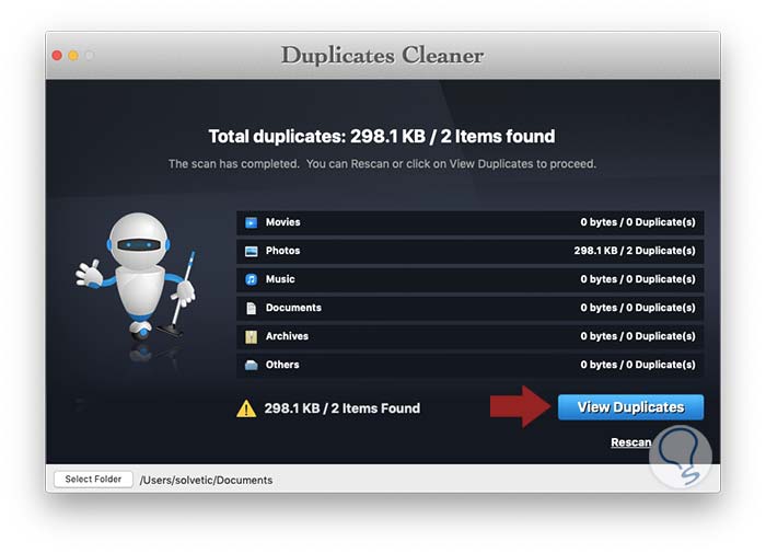 Una vez seleccionemos la carpeta veremos todas las secciones disponibles y donde hayan duplicados se indica el tamaño ocupado y la cantidad de duplicados que han sido detectados. Allí damos clic en el botón “View Duplicates”