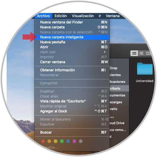 Accedemos al Finder en macOS y seleccionaremos la ubicación deseada donde se creará la carpeta inteligente, en este caso en el escritorio, y nos dirigimos al menú Archivo y seleccionamos la opción Nueva carpeta inteligente: