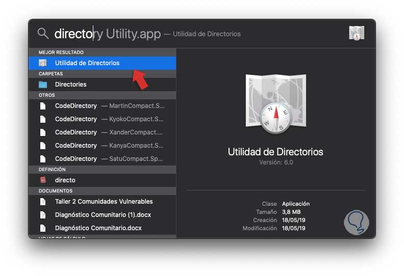 Para usar este método, accedemos Spotlight y al digitar el término directorio veremos lo siguiente: