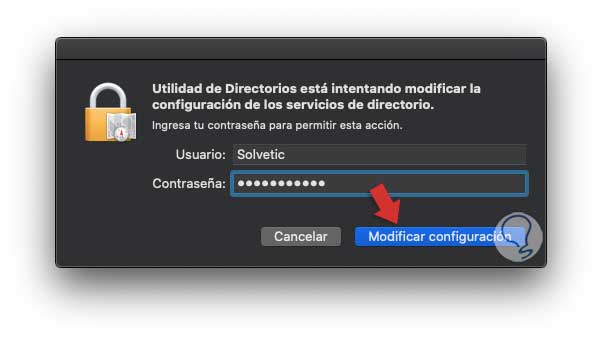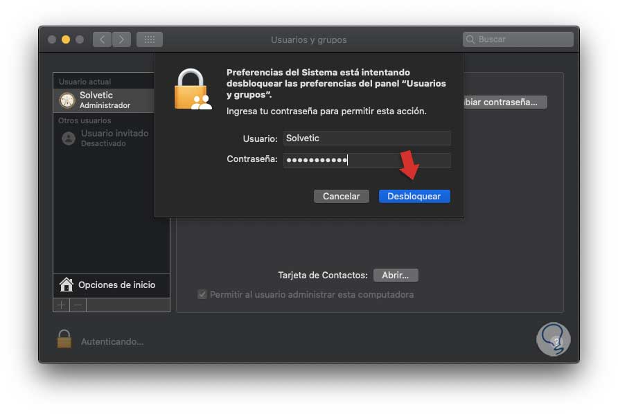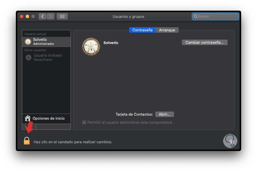 Daremos clic en el icono de candado ubicado en la parte inferior con el fin de realizar cambios en la tarea y será necesario ingresar la contraseña de administrador de macOS Catalina: