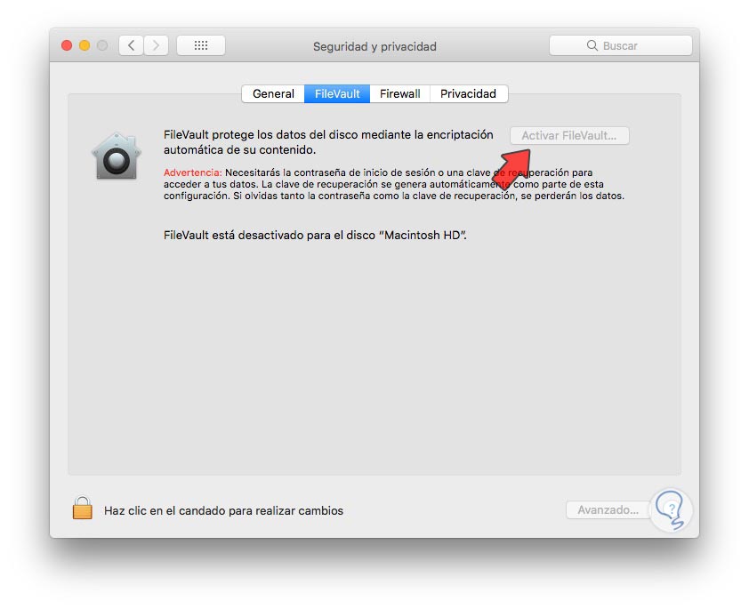 Verás en la parte superior la pestaña de "FileVault". Lo que debes hacer es entrar en este apartado y desactivarla.