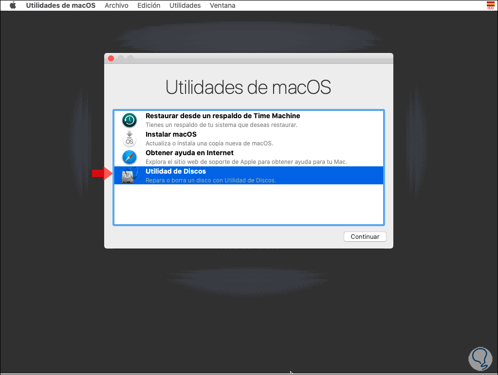 Para esto, debemos encender o reiniciar el equipo. Y durante el proceso de arranque pulsar las teclas siguientes donde será desplegada la siguiente ventana. Allí seleccionamos Utilidad de discos y repetimos el proceso explicado anteriormente.