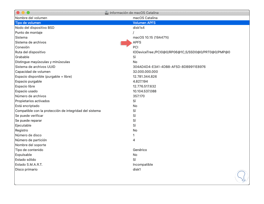 Aunque allí ya podemos ver que se trata de APFS podemos dar clic en el icono "Información" para obtener a detalles mucho más completos no sólo del sistema de archivos sino también del disco en general: