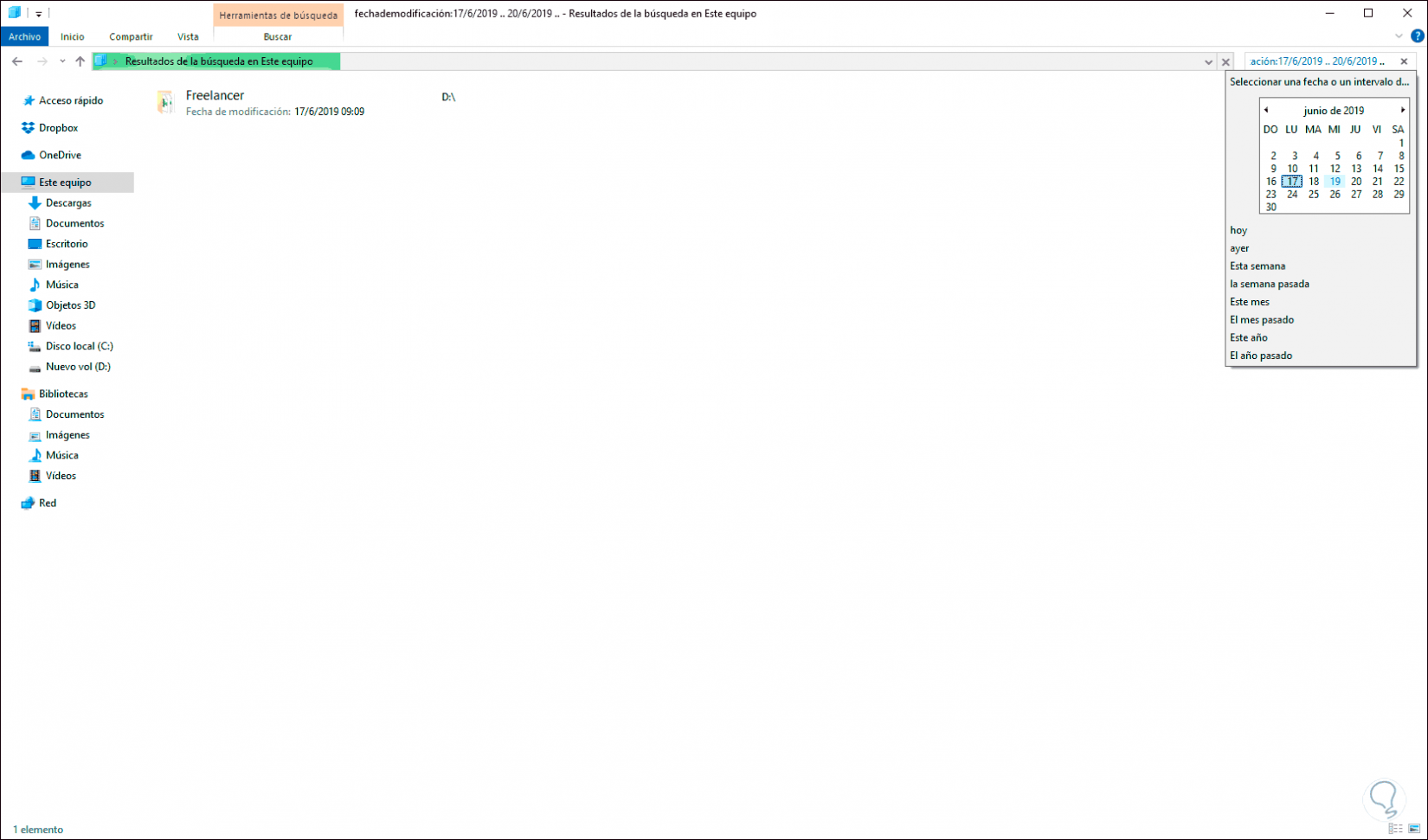 Para este método accedemos al Explorador de archivos y allí será posible ingresar el rango de fechas deseado en el cuadro de búsqueda ya sea global o de una carpeta en específico