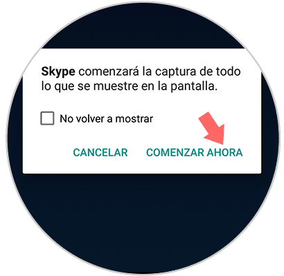 Ahora verás que aparece una ventana emergente en la que serás informado de que "todo lo que se muestra en pantalla, incluida las notificaciones se grabará". Selecciona "Skype" e "Iniciar transmisión"