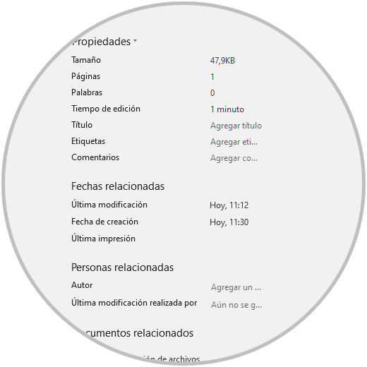 Pulsamos en “Cerrar” para salir del asistente y como resultado general veremos que en las propiedades del documento no existen datos a mostrar: