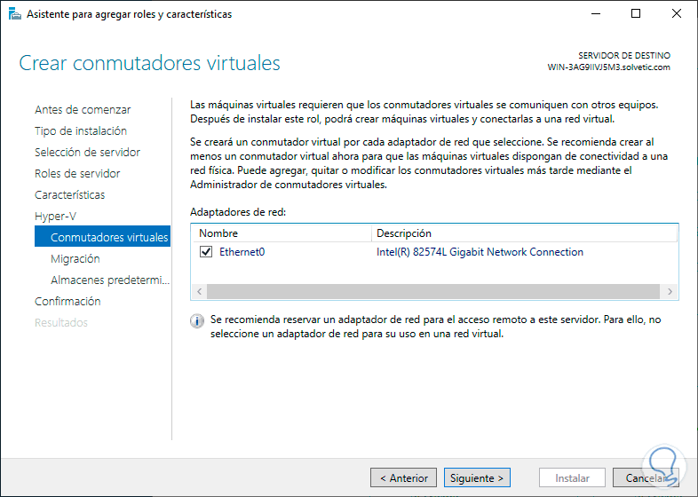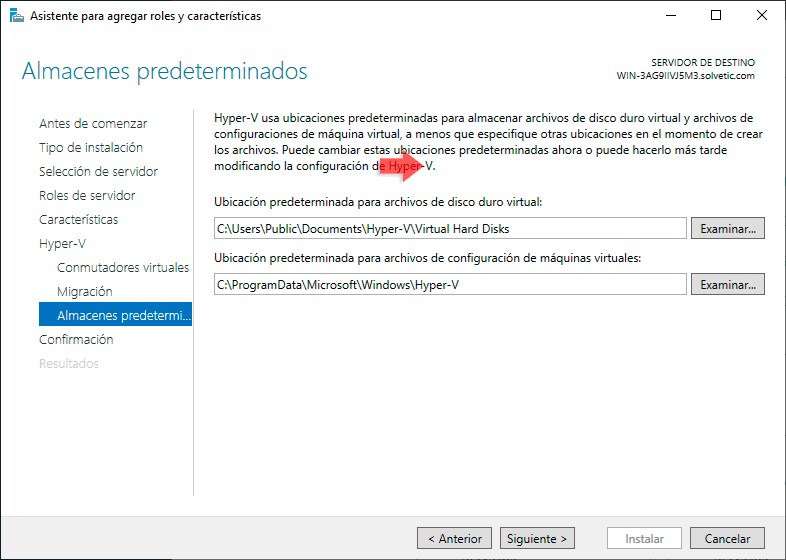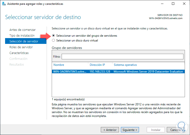 En la siguiente ventana seleccionaremos el servidor donde se instalará Hyper-V: