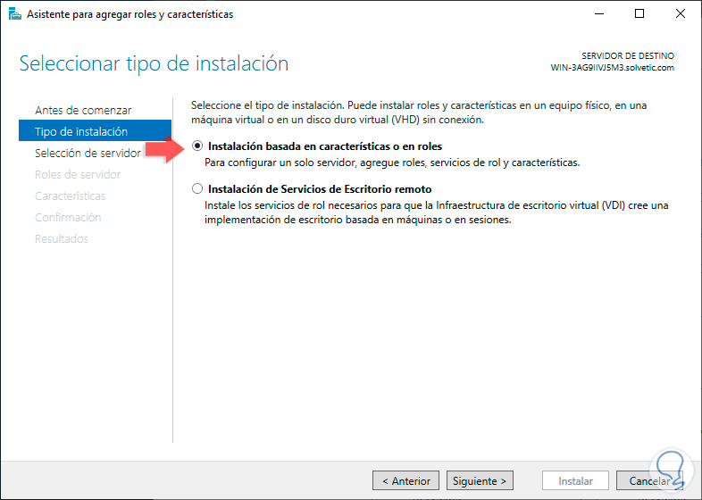 Damos clic en Siguiente y ahora activamos la casilla “Instalación basada en características o roles”: