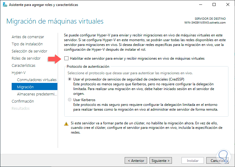 Allí seleccionamos el adaptador principal para gestionar desde allí la comunicación y damos clic en Siguiente. Ahora podemos configurar Hyper-V para que esté en la capacidad tanto de enviar como de recibir migraciones de nuevas máquinas virtuales en vivo: