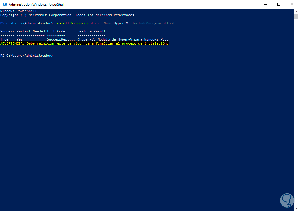 Como vemos, Hyper-V ha sido instalado de forma correcta y ahora solo resta reiniciar el sistema para completar el proceso, si deseamos que el reinicio sea automático debemos ejecutar lo siguiente: