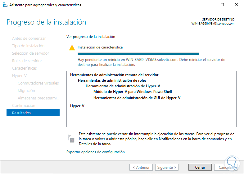 Una vez esta tarea finalice veremos lo siguiente. El siguiente paso consiste en reiniciar el servidor para que Hyper-V quede listo para su uso.