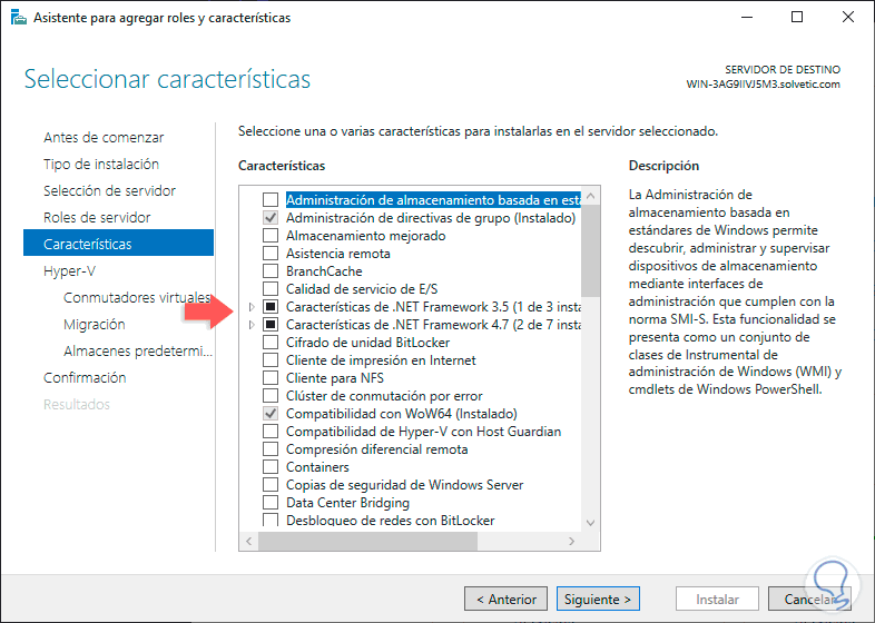 Damos clic en Siguiente para acceder a la sección “Características”:
