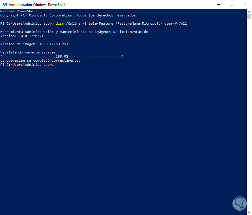 A través de DISM es posible instalar Hyper-V, para ello vamos de nuevo a PowerShell como administradores y esta vez ejecutamos lo siguiente: