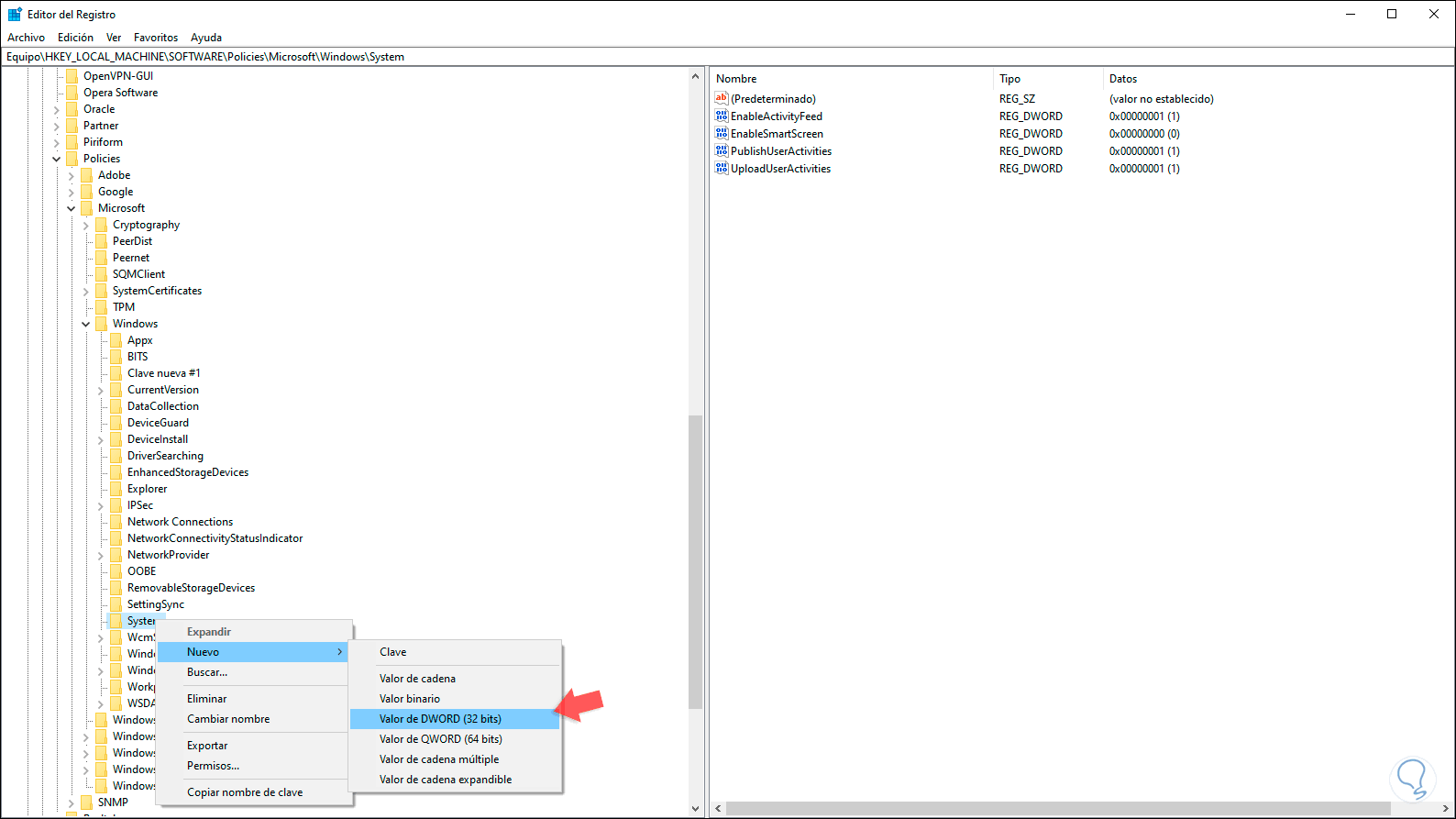 Allí damos clic derecho sobre la clave “System” y seleccionamos la opción Nuevo / Valor de DWORD (32 bits):