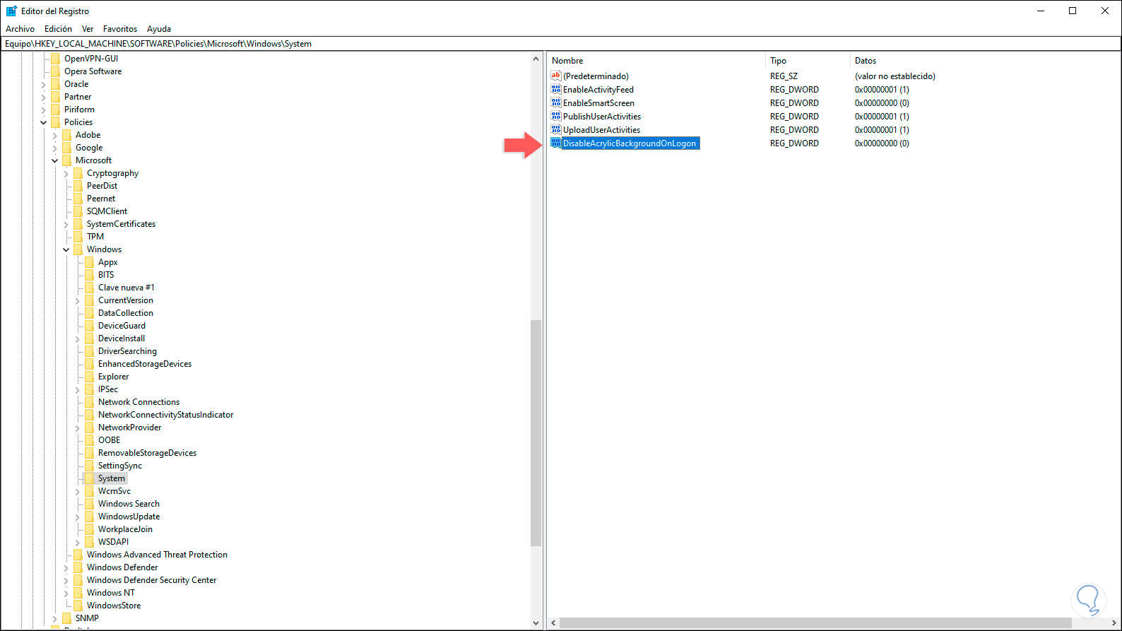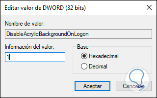 Este nuevo valor DWORD será llamado “DisableAcrylicBackgroundOnLogon”: