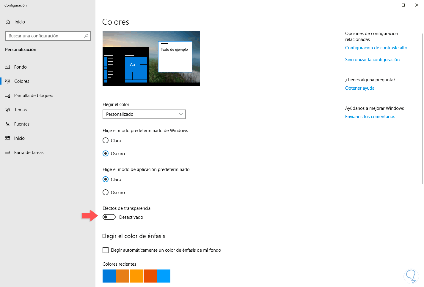 En la ventana desplegada vamos a la sección “Colores” y allí debemos pulsar sobre el interruptor de la opción “Efectos de transparencia” con el fin de que su estado pase a ser desactivado: