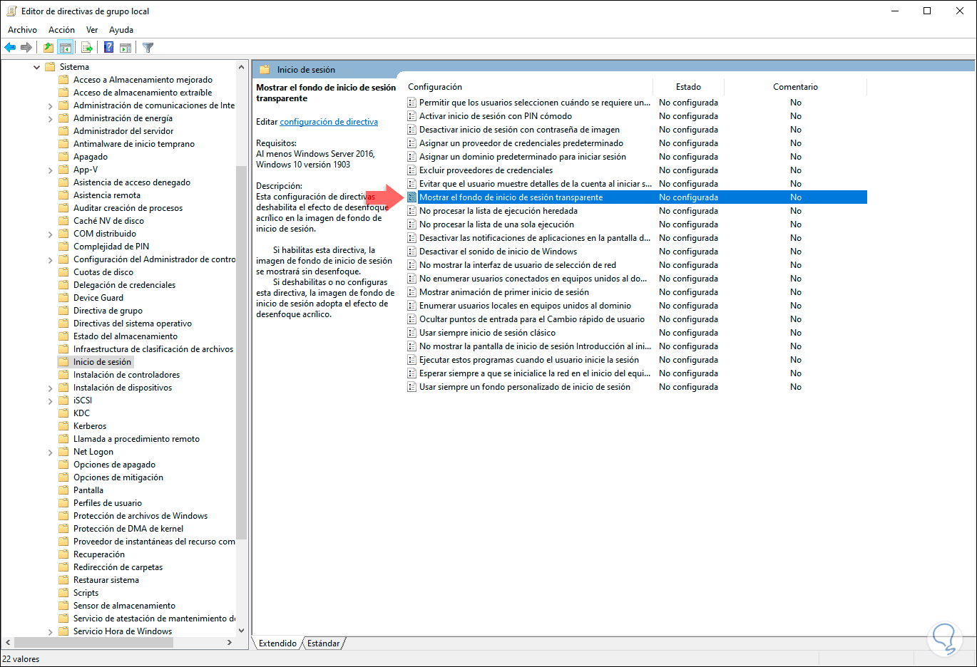 En las políticas centrales ubicamos una llamada “Mostrar el fondo de inicio de sesión transparente”: