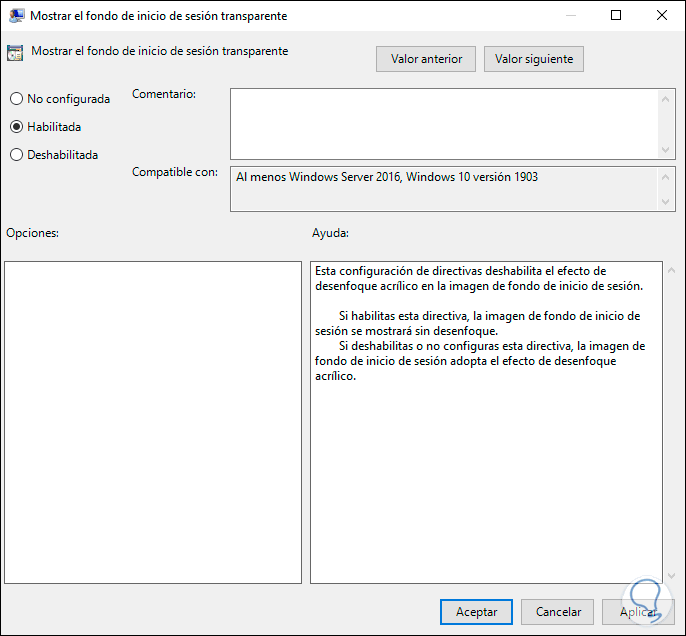 Damos doble clic sobre esta política y en la ventana emergente activamos la casilla “Habilitada”. Pulsamos en Aplicar y Aceptar para guardar los cambios y el objetivo de esta política es deshabilitar el desenfoque de Windows 10.