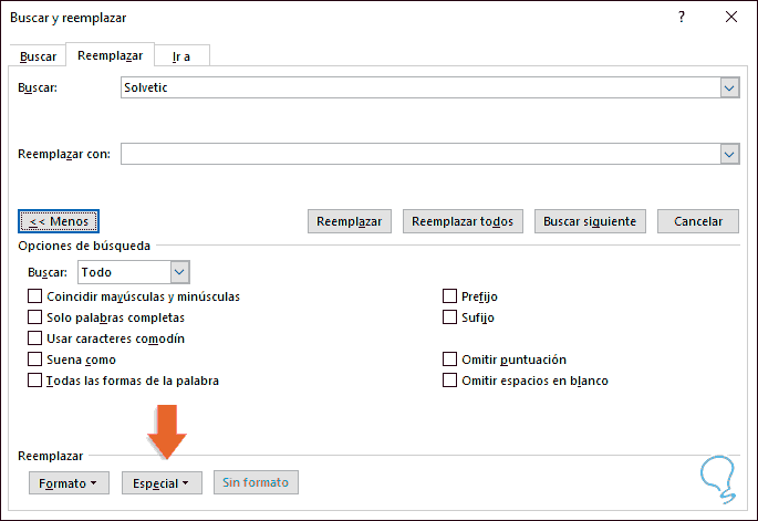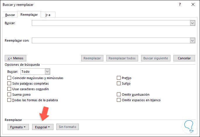 Damos clic en el botón “Más” y ubicaremos el cursor en el campo “Reemplazar con” y seguidamente damos clic en el campo desplegable “Especial” ubicado en la parte inferior: