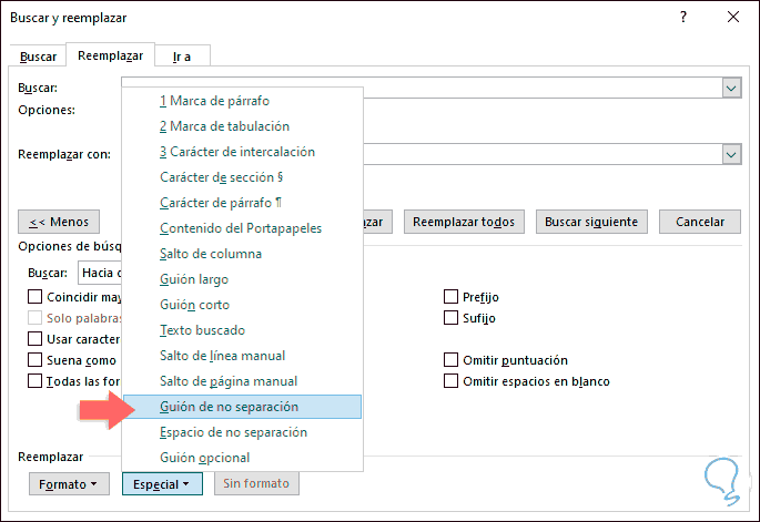 Ubicamos el cursor en el campo “Reemplazar con” y damos clic sobre el botón Especial y esta vez seleccionamos la opción “Guion de no separación”: