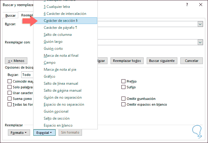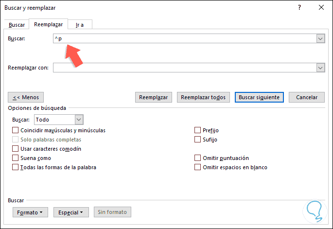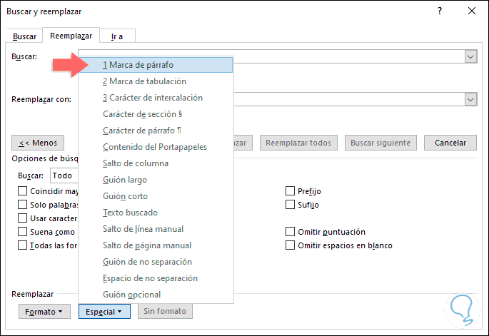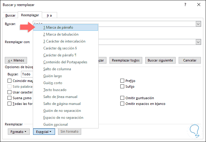 Ubicamos el cursor en el campo Buscar y damos clic en “Especial” para seleccionar la opción “Marca de párrafo”: