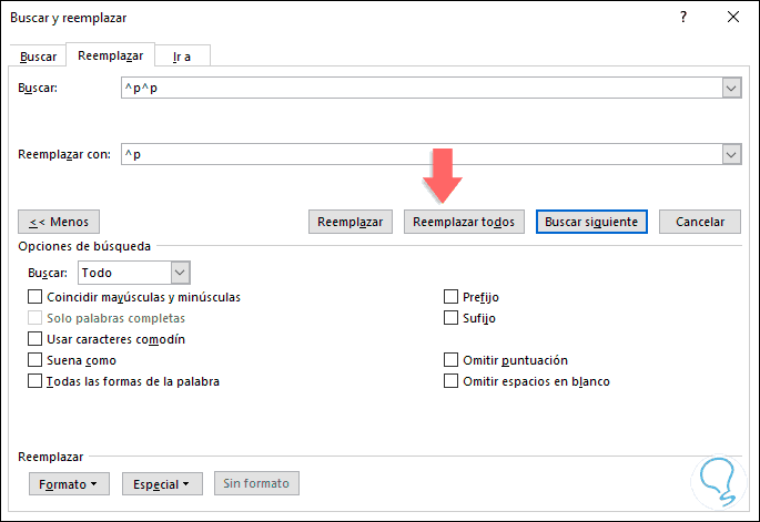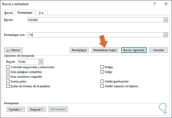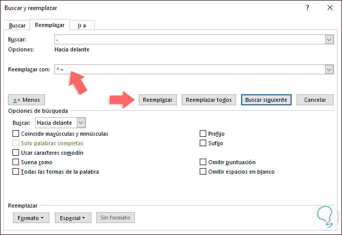 Ahora veremos que en el campo “Reemplazar” estará lo siguiente “^~”: