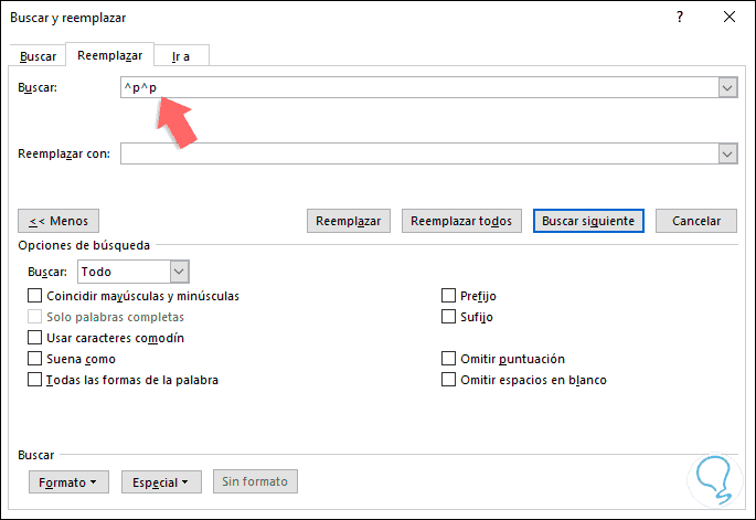 Repetimos el proceso con el fin de añadir otra marca de párrafo en el campo “Buscar” (esto se debe a que vamos a reemplazar el doble párrafo en el documento):