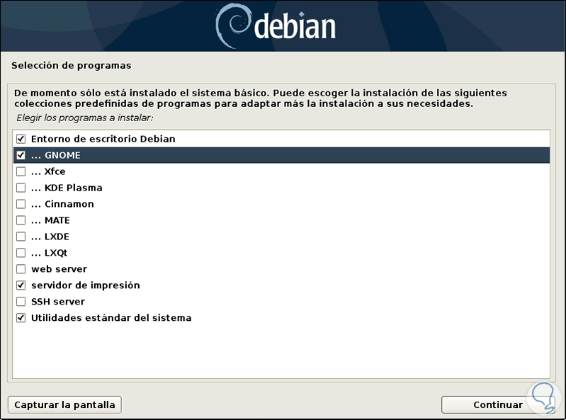 En la siguiente ventana podremos definir el tipo de entorno que deseamos usar para Debian 10: