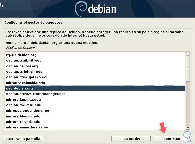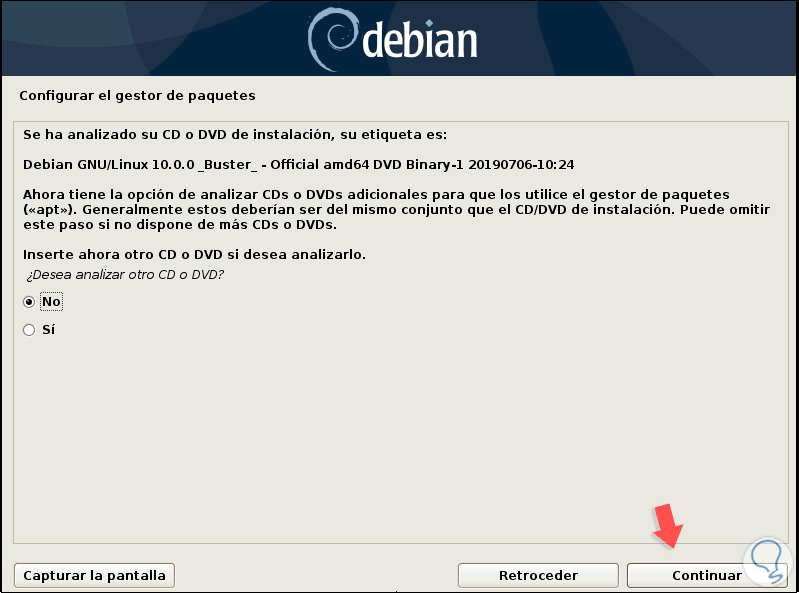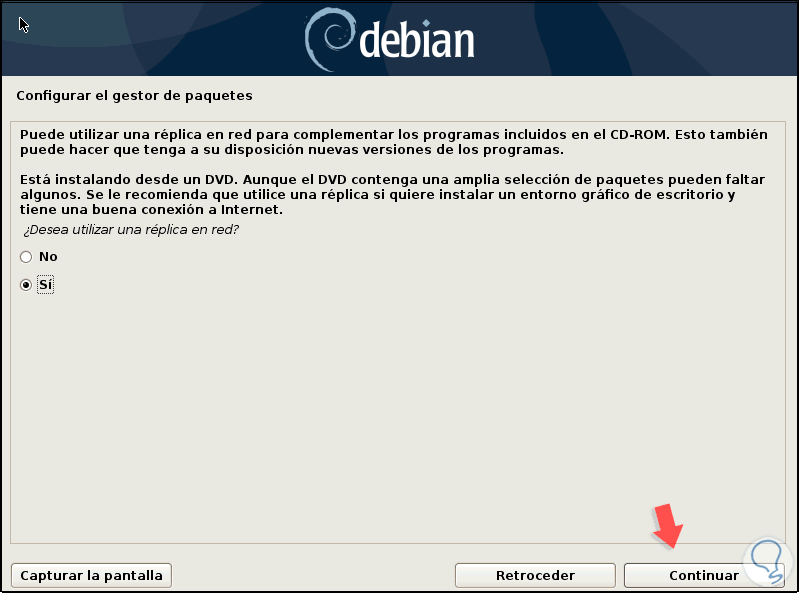 Esta opción permite el análisis de otro CD/DVD si contamos con él, si no es así seleccionamos No y pulsamos en Continuar. Después de esto será posible hacer uso de réplicas de la imagen de Debian 10 en la red que nos ayudan a optimizar el funcionamiento del sistema: