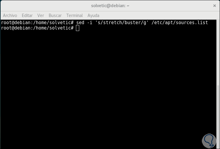 En primer lugar, vamos a preparar los paquetes del repositorio en Debian 9 (en este caso) para que se analicen las dos versiones que son "Stretch" and "Buster", para esto ejecutaremos la siguiente línea: