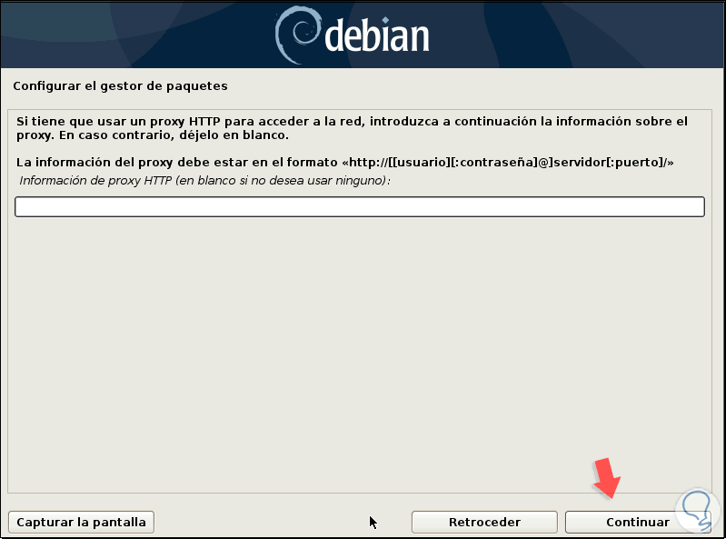 En la siguiente ventana podemos ingresar información del servidor proxy si hacemos uso de alguno, si no es así podemos dejar este campo en blanco: